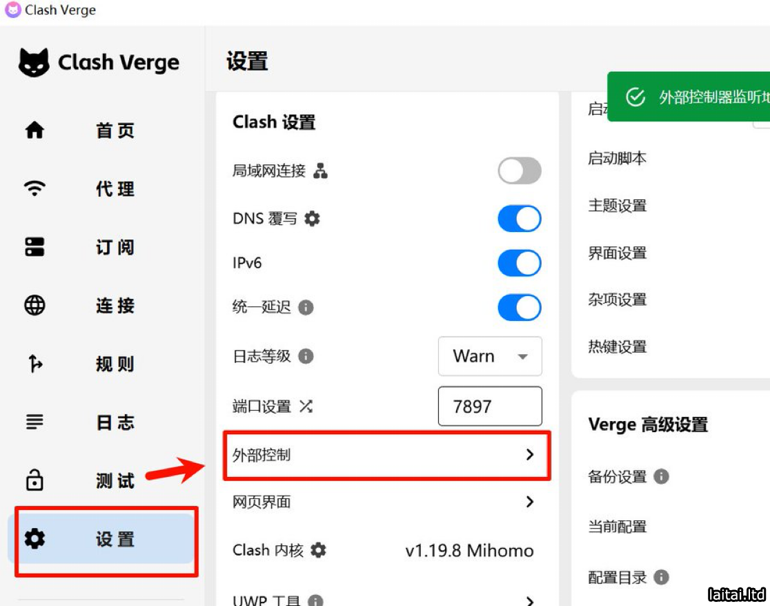 打开 Clash Verge 点击设置、Clash 设置、外部控制、添加密码验证。