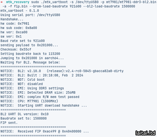 sudo ./mtk_uartboot -s /dev/ttyUSB0 -p mt7981/mt7981-ddr3-bl2.bin -a -f fip.bin --brom-load-baudrate 921600 --bl2-load-baudrate 1500000