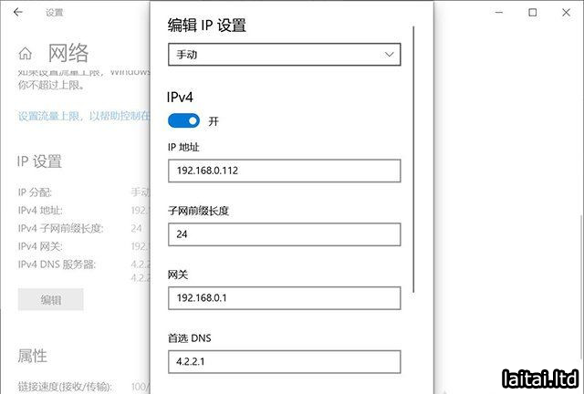 图二 Windows10的IPV4设置界面(“子网前缀长度”正确的设置参数)