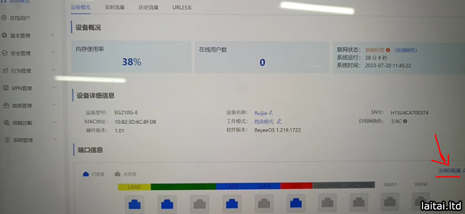 3、然后到设备概览界面可以看到插入的网线,然后点击多网段配置