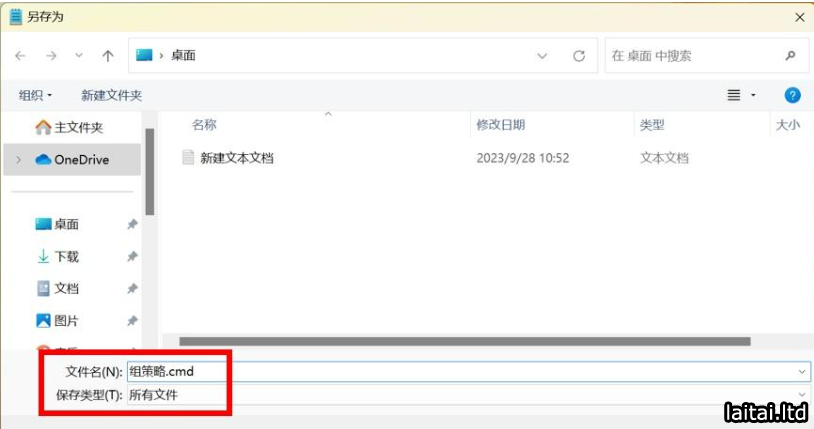保存类型设置为“所有文件”,文件名设置成:组策略或其它名称.cmd,文件保存格式选择ANSI,否则会出现乱码。