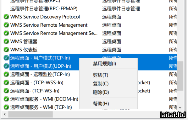 找到默认的“远程桌面 - 用户模式(TCP-In)/(UDP-In)”规则,右键选择“禁用规则”,以提升安全性。