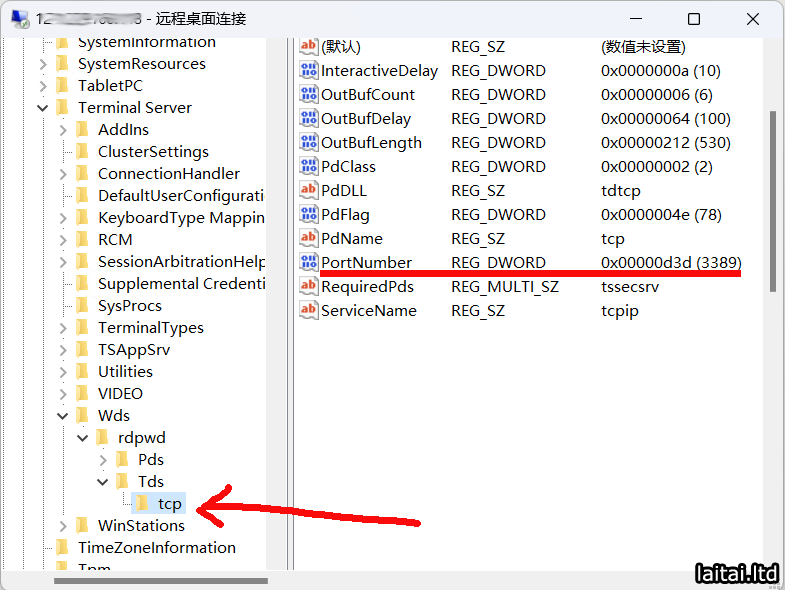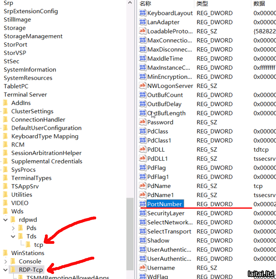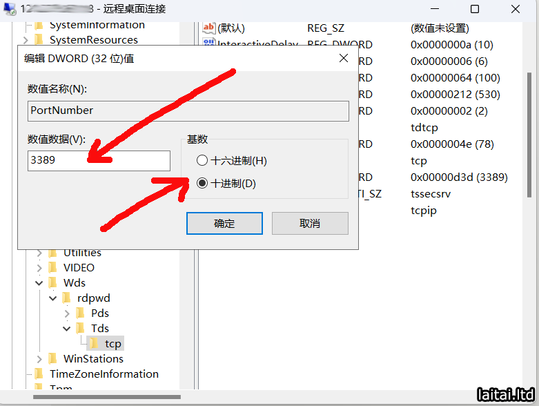 分别在TCP和RDP-Tcp右边双击 “PortNumber” 值,用十进制方式显示,默认为3389,改为自己需要的端口。
