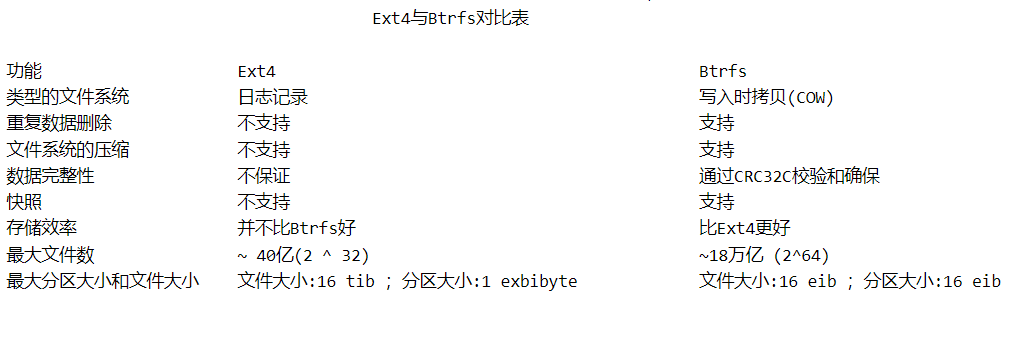 在各种关键特性上对Ext4 和 Btrfs文件系统进行比较。