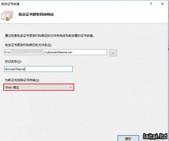 在“完成证书申请”界面,选择证书文件并填写相关信息,点击确定。导入证书前建议将文件名改为你的域名。