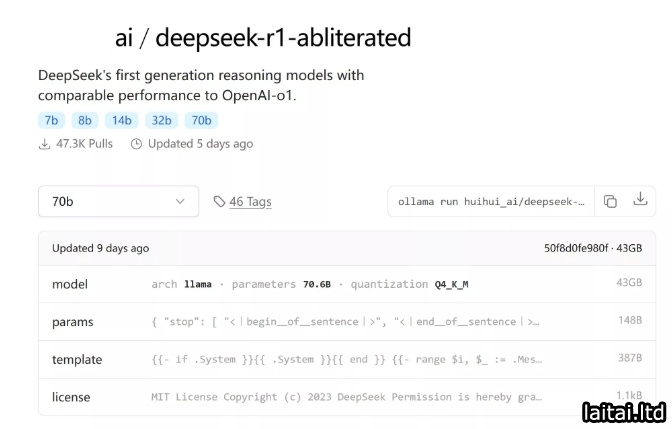 下载链接:https://ollama.com/huihui_ai/deepseek-r1-abliterated:70b
