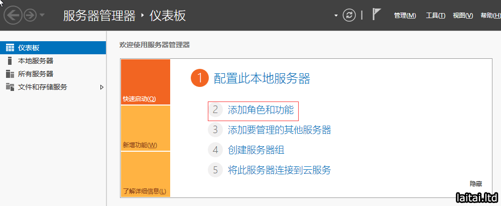 在需要安装AD域控制器的电脑上打开服务器管理器,点击添加角色和功能