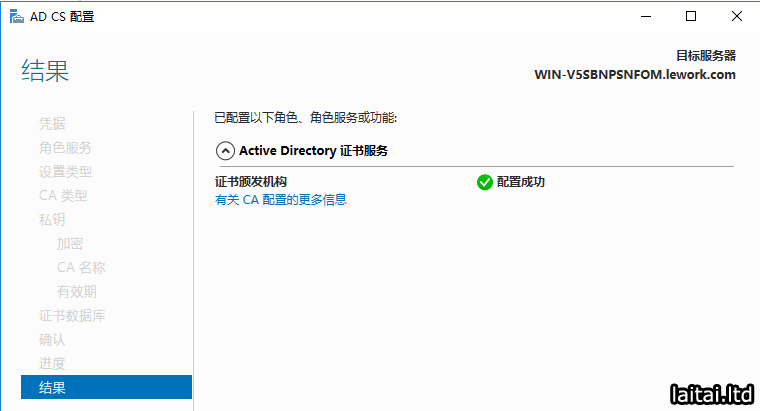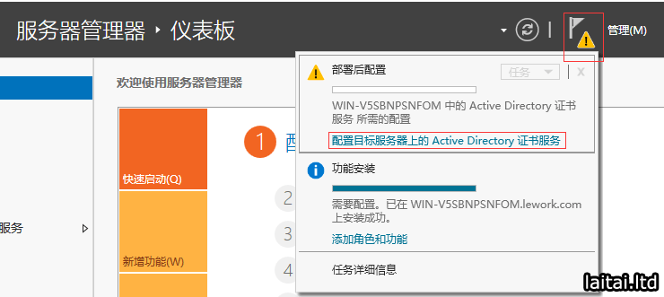 点击通知-配置目标服务器上的Active Directory 证书服务