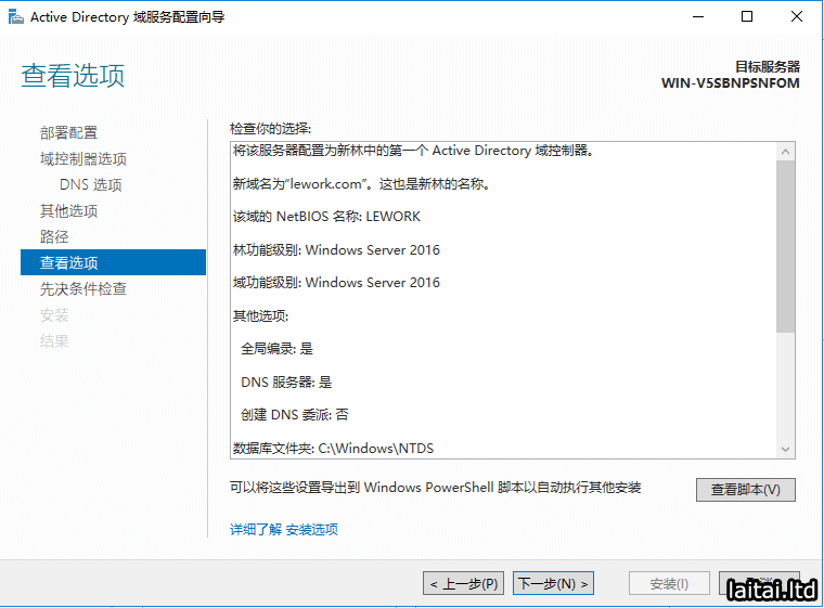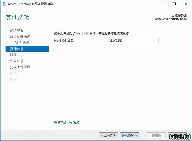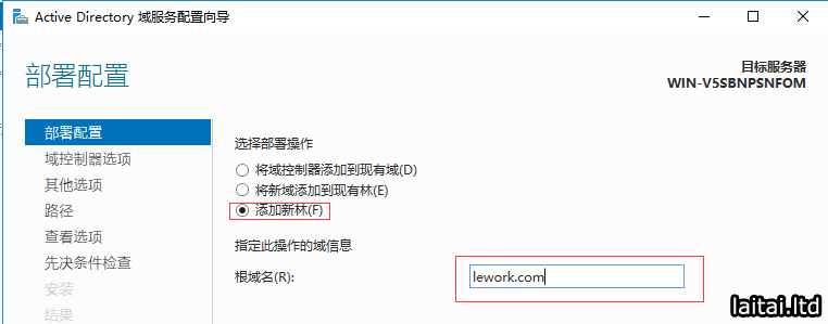 打开AD DS的部署向导,由于我们这里是部署新的AD控制器,所以部署配置选择添加新林,把根域名设置成lework.com,点击下一步