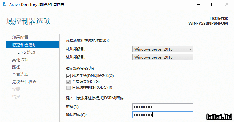 域功能级别(只包含Windows Server 2016域功能):Windows Server 2016 指定域控制器功能:默认