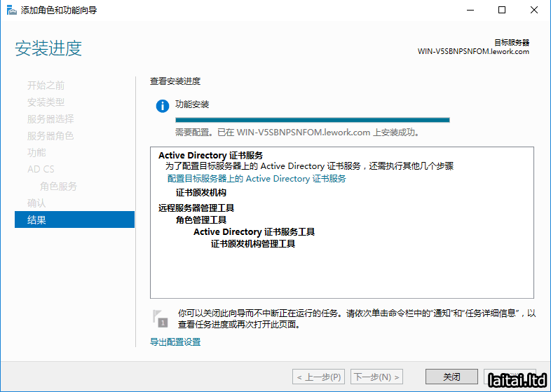 Active Directory域服务角色安装完成,点关闭