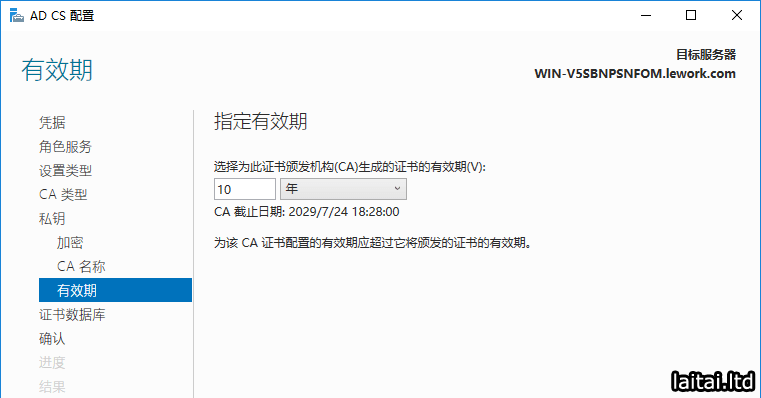 指定有效期,这里设置为10年,点击下一步