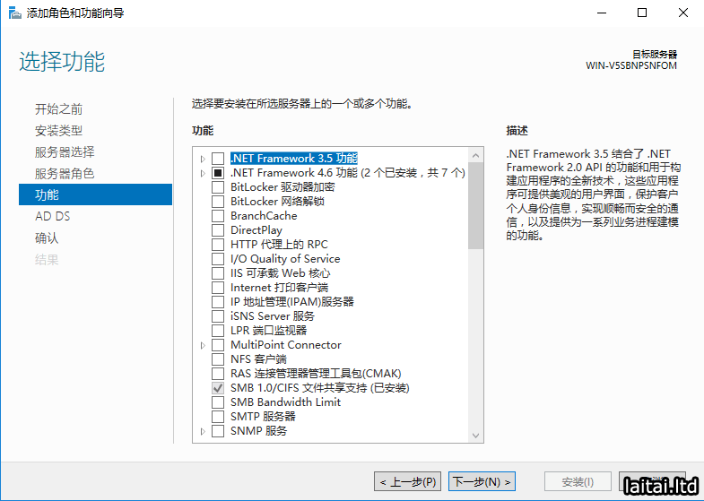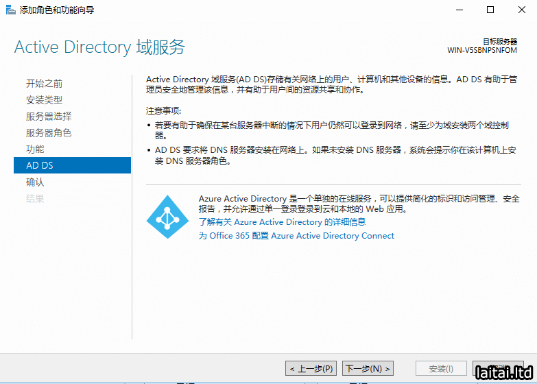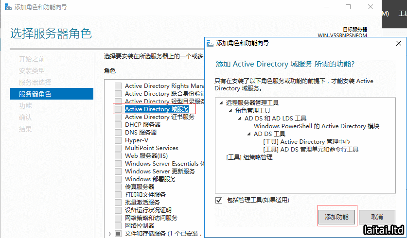 服务器角色选择Active Directory域服务,会弹出添加Active Directory域服务所需的功能?,点击添加功能