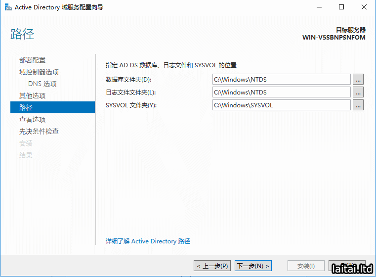 设置AD DS的数据库、日志文件和SYSVOL的位置,点击下一步
