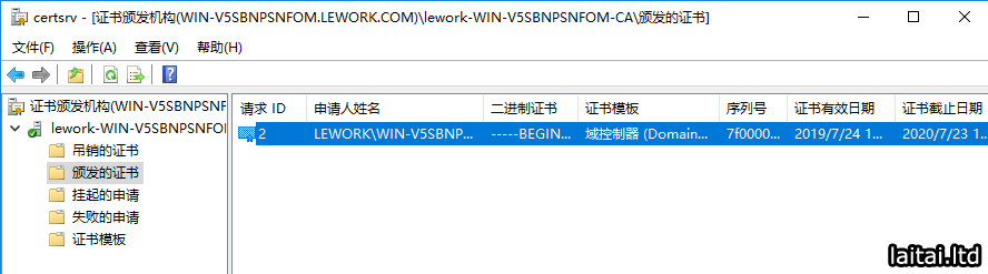 在证书颁发机构中可以看到给域控颁发的证书