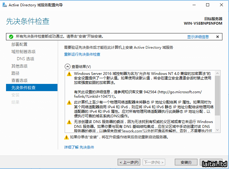先决条件检查通过,点击安装,如果不通过请根据提示查看原因