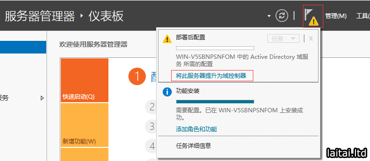运行AD DS(Active Directory域服务的简称)部署向导,打开本地服务器的服务器管理器,点击通知-将此服务器提升为域控制器