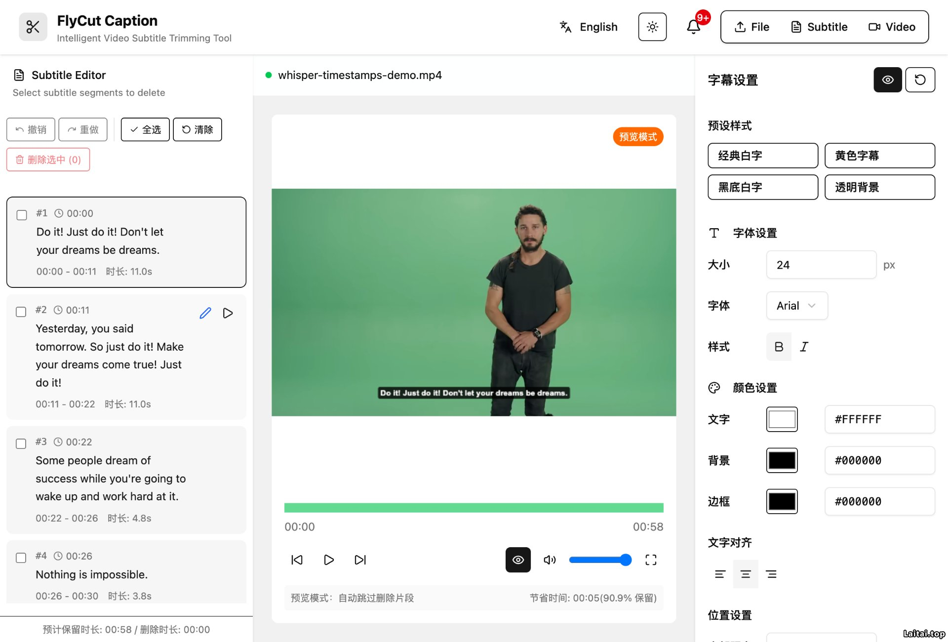 基于 Whisper 模型做语音识别,支持多语言,生成的字幕带时间戳,可以直接在可视化界面里选中删除不要的片段,实时预览效果。