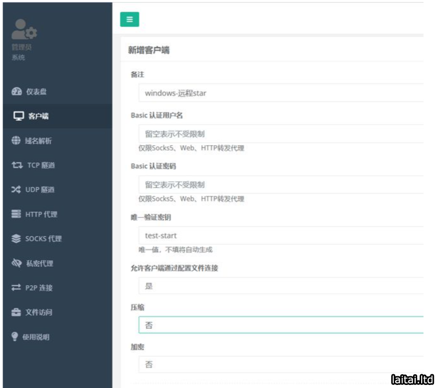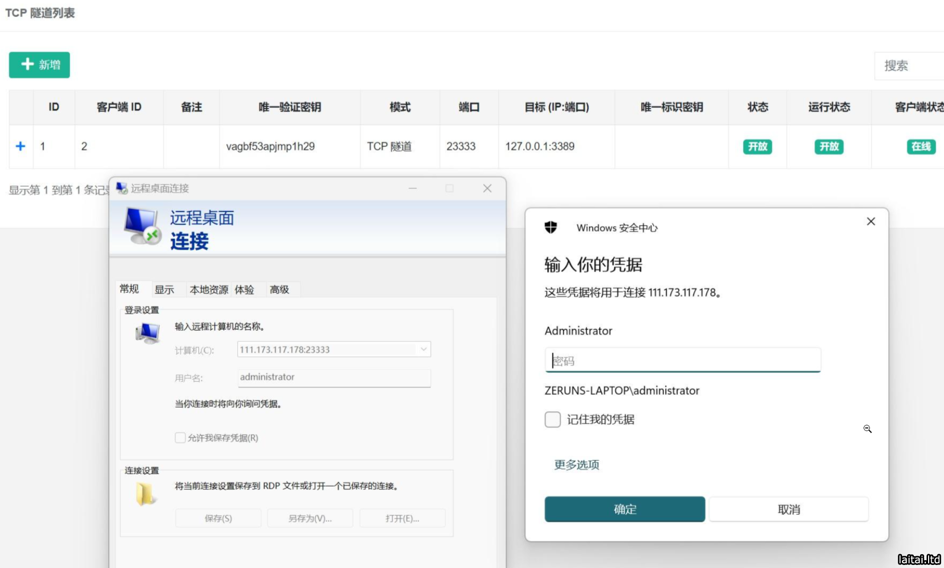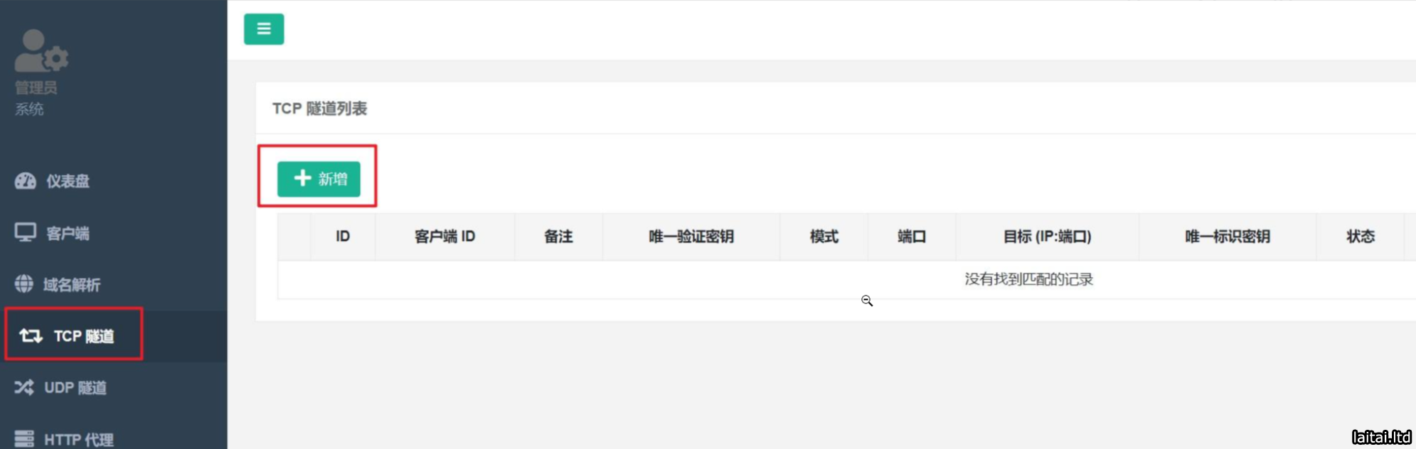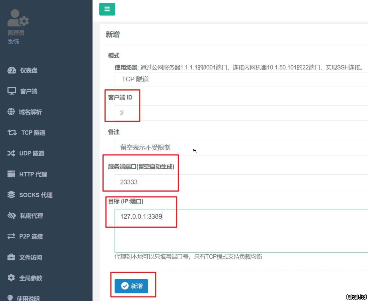 客户端ID填写你上面添加的客户端的ID,服务端端口填写想映射到服务器的哪个端口,目标IP端口填写你客户端想要映射的端口,IP填127.0.0.1表示本机,也可以填局域网内的其他设备的IP,可将局域网内的其他设备端口映射出去,我这里就填了本机的3389端口,填好后点击新增就行。