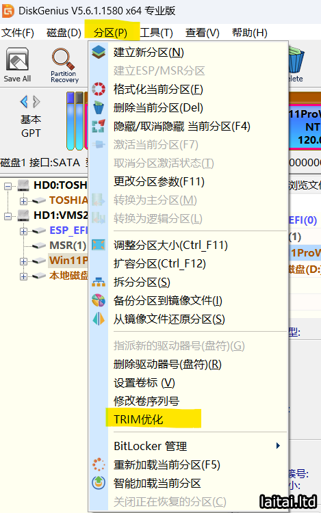 如DiskGenius,运行DiskGenius后打开后选择固态硬盘,再点击上方菜单里的“分区"选项,在下拉菜单中直接点击"TRIM优化",或者直接在固态硬盘分区上点击鼠标右键,在弹出选项里选择"TRIM优化":