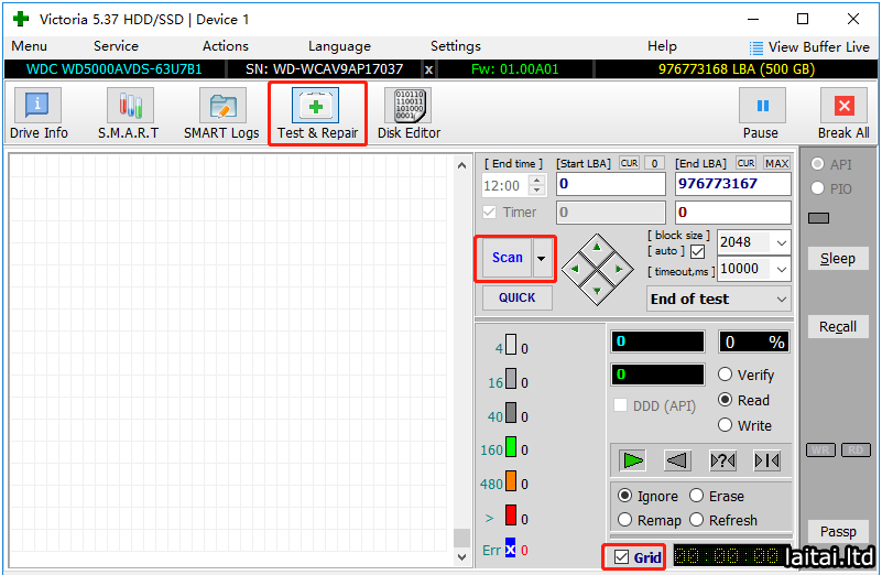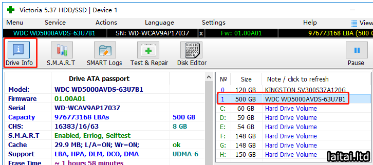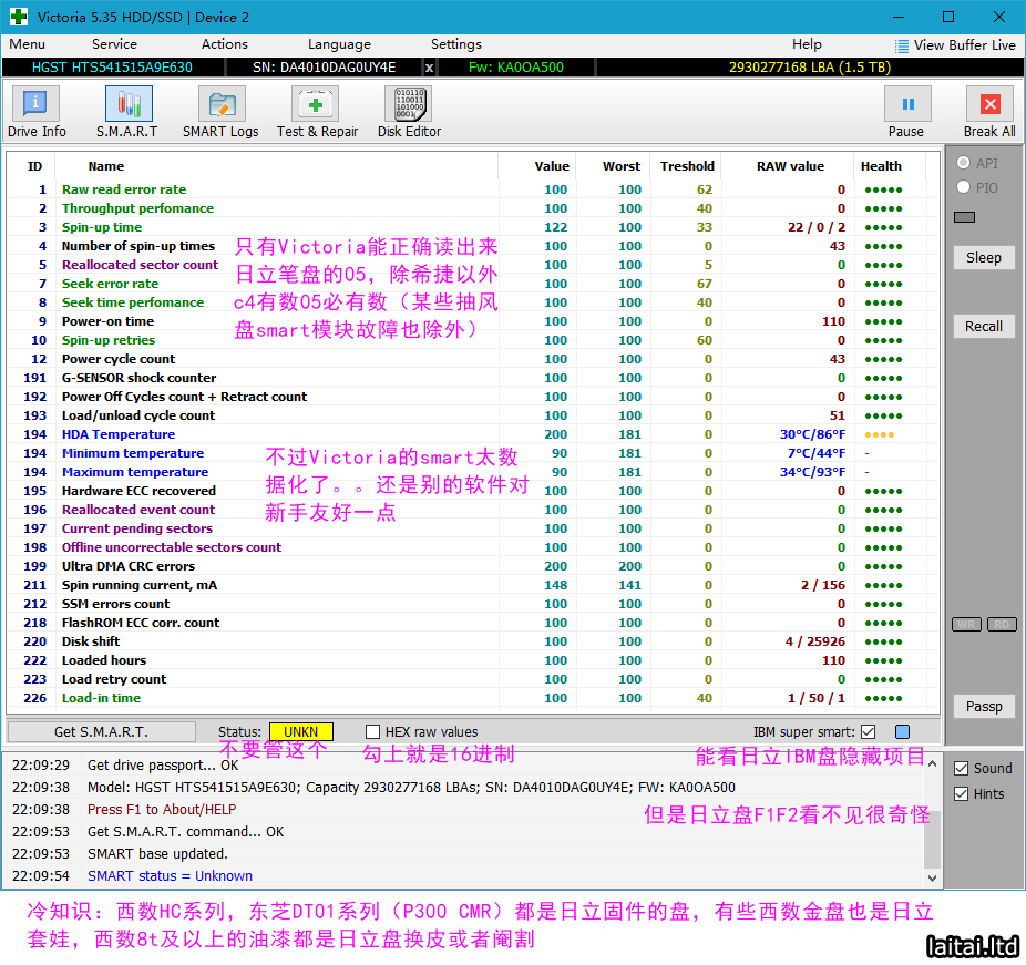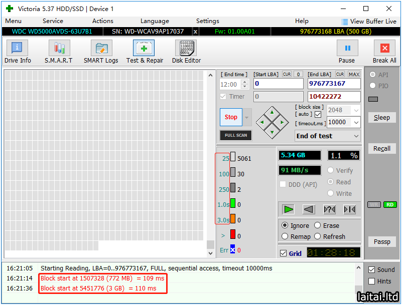 扫描日志保存在 Victoria 所在目录下 LOGS\硬盘名称\eventlog (比如我的:D:\Programs\Victoria537\LOGS\WDC WD5000AVDS-63U7B1__WD-WCAV9AP17037\eventlog.txt)