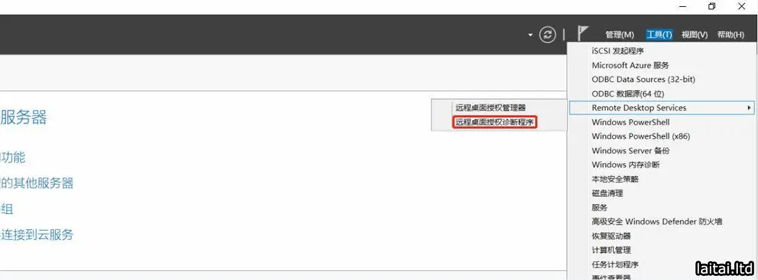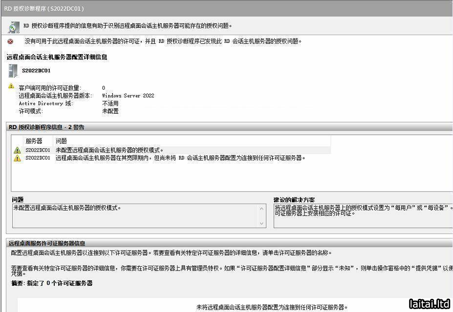 1.打开“远程桌面授权诊断程序”,查看当前服务器授权状态如下,可以看到此时并未配置完成,远程桌面会话主机服务器并未指向许可证服务器。