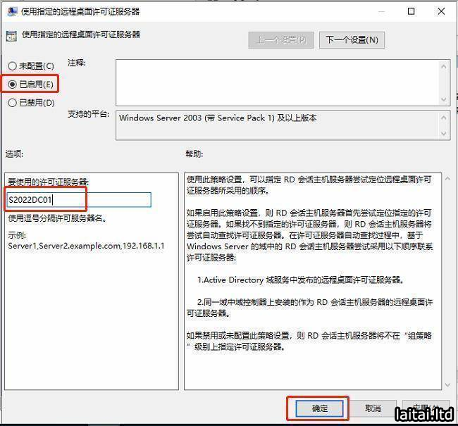 4.双击打开“使用指定的远程桌面许可证服务器”,并点选“已启用”,在“要使用的许可证服务器”中输入之前激活的许可证服务器主机名或IP。(如远程桌面会话主机服务器与许可证服务器为同一台服务器,直接输入本机的IP或者主机名即可。)