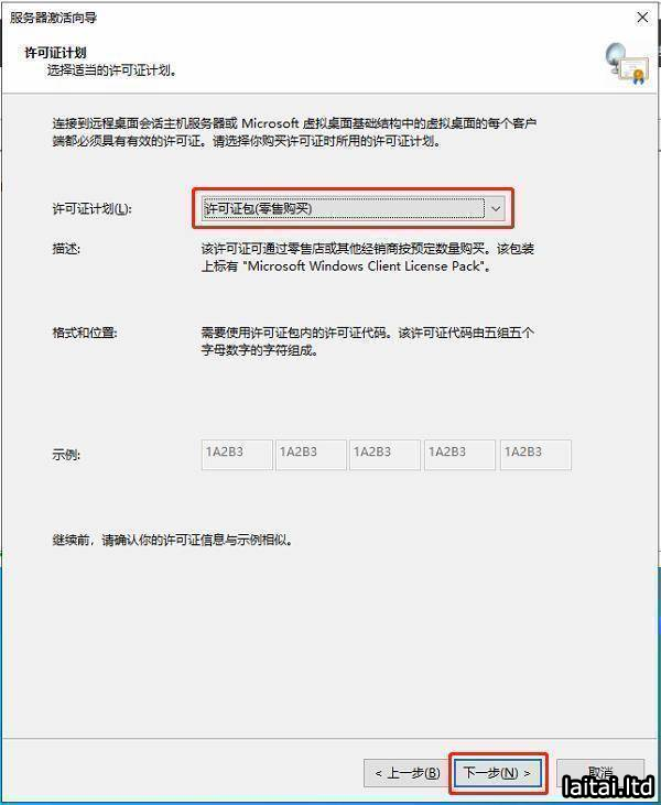 9.选择许可证计划,本例选择“许可证包(零售购买)”,然后单击“下一步”。(如果您是服务提供商,请选择“服务提供商许可协议”)
