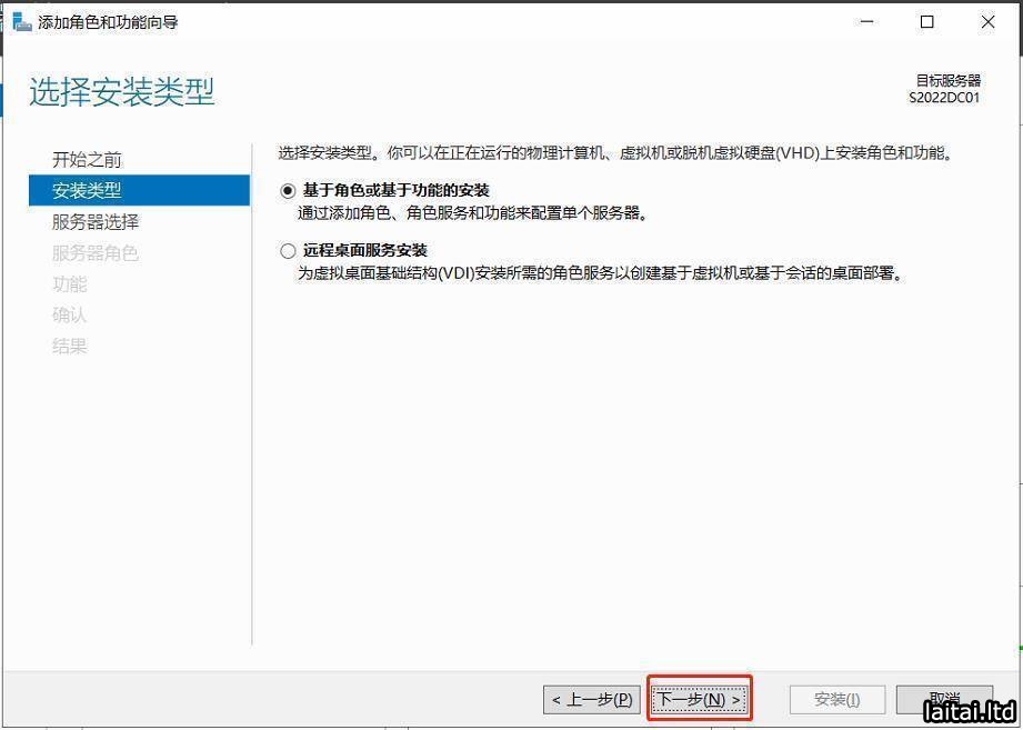4.“安装类型”选择“基于角色或基于功能的安装”,并单击“下一步”。