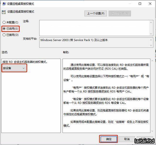 5.双击打开“设置远程桌面授权模式”,并点选“已启用”,设置“指定RD会话主机服务器的授权模式“,本例为”按设备“。(根据许可证的类型选择)