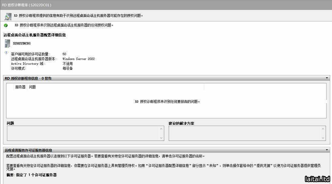 如上图返回无错重启服务器,再次打开“远程桌面授权诊断程序”,如无任何报错信息,则对于Server未加域情况且基于设备的授权模式,整个配置过程完成。