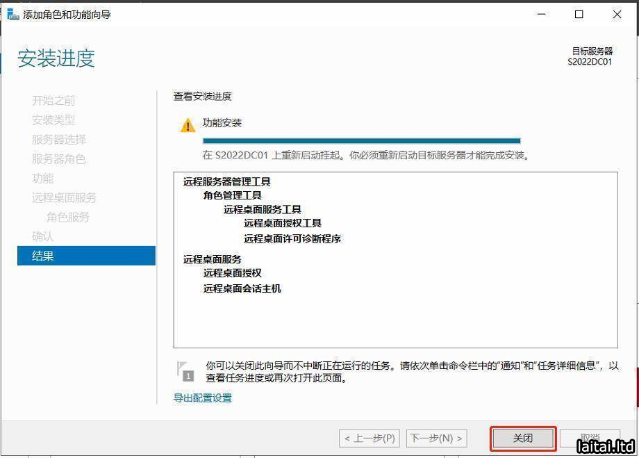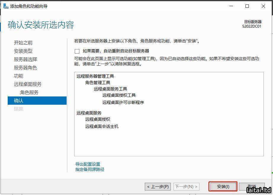 8.单击“安装”,等待几分钟完成安装并重启服务器。