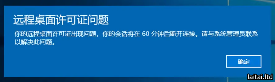 备注:对于Server未加入域且基于用户的授权模式情况,远程桌面用户访问远程桌面会话主机服务器时会提示有60分钟时限如下图所示,超过时限将强制断开连接。因此Server未加入域情况下建议选择基于设备的授权模式。