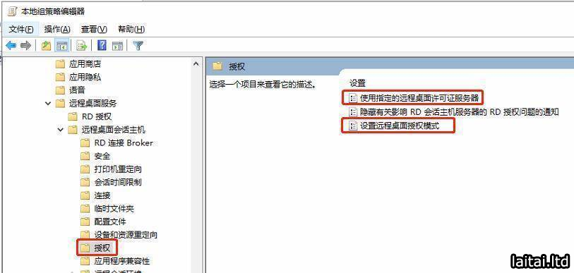 3.展开“本地计算机策略>计算机配置>管理模板>windows组件>远程桌面服务>远程桌面会话主机>授权”,在右侧找到 “使用指定的远程桌面许可服务器”和“设置远程桌面授权模式”两项策略。
