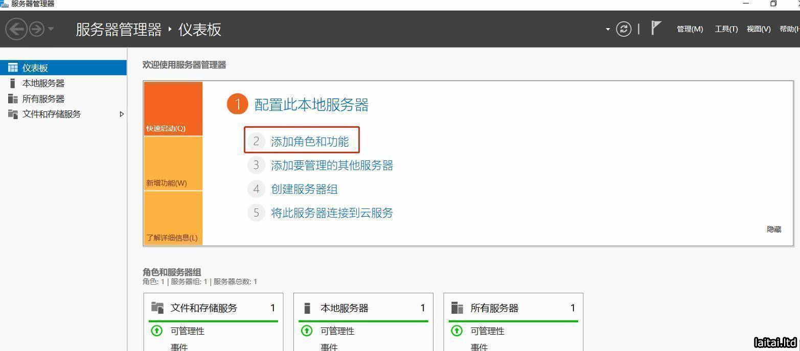 2.在服务器管理器>仪表板界面,单击“添加角色和功能”。