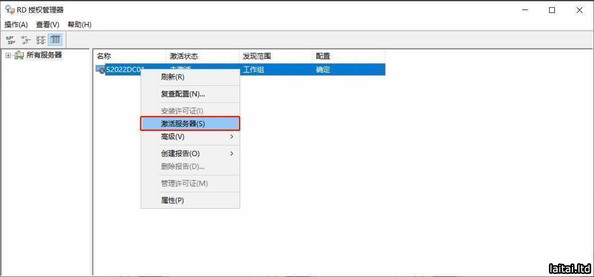 2.右键单击待安装许可证的服务器,然后单击“激活服务器”。