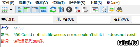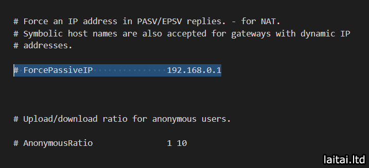 错误信息:550 Could not list: file access error: couldn't stat: file does not exist默认客户端端口21默认Pure-Ftpd被动端口范围39000~40000默认pure-ftpd配置文件位置一般在/etc/pure-ftpd/pure-ftpd.conf除了防火墙放行相应端口外,需将配置文件下图中的ForcePassiveip前面的#号删除并将后面的IP地址改为pure-ftpd服务端所在服务器的公网IP